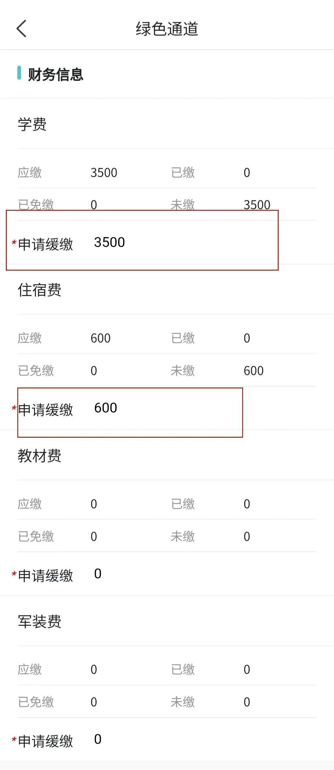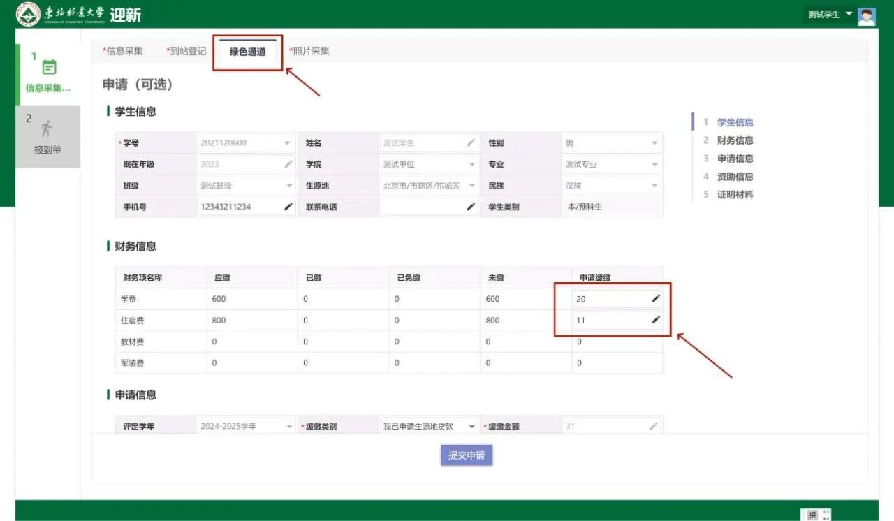 第二步,登录“迎新服务”后,点击“绿色通道”进入申请页面。第三步,在“绿色通道”界面项下的“财务信息”栏内,如实填写应缴、未缴及申请缓缴金额。教材费、军装费不可申请贷款。然后在缴费类别下拉菜单下选择“生源地贷款”或“校园地贷款”。本科生(含预科生)也可根据需要申请“新苗”爱心资助 。新生于入学报到日,携带相关材料到新生入学绿色通道报到处办理相关资助业务。