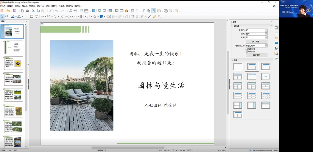 4.范金萍员工以“园林与慢生活”为主题,结合有关概念,为我们勾勒出园林人的慢生活美好画卷。
