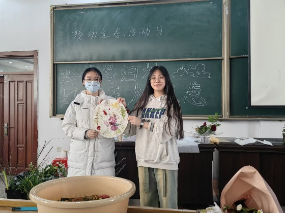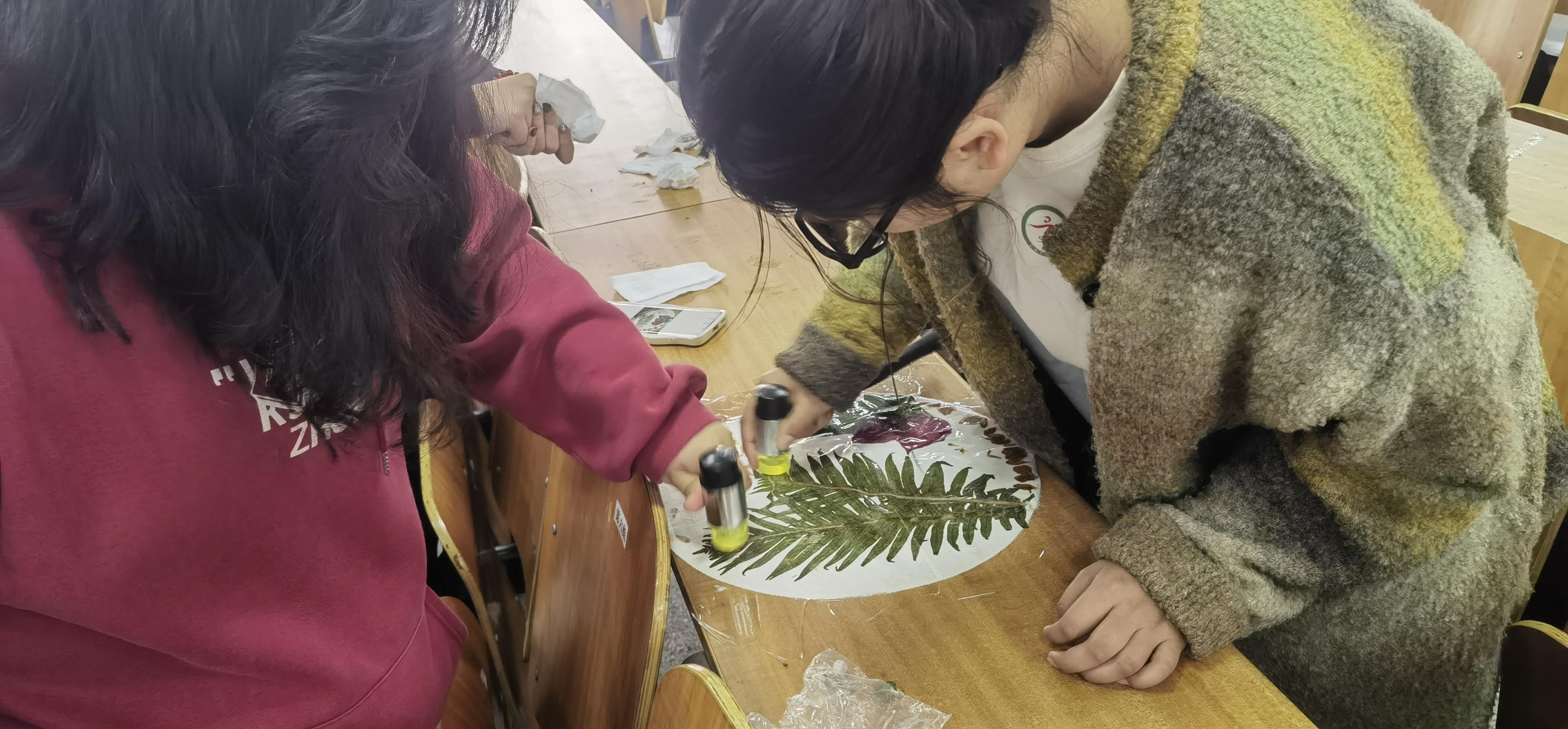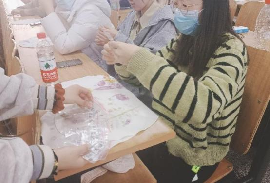 随后,我们开展了植物拓染环节。在志愿者对植物拓染的背景与步骤进行讲解的过程中,大家认真聆听,严谨提问,在后续的实际操作中悉心实践,同时志愿者在旁耐心解惑。各位同学最终在志愿者的帮助下完成了自己的创意作品。